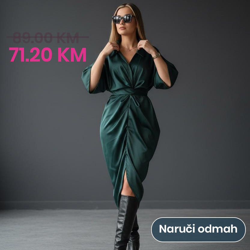 Elegantna haljina s preklopnim V-izrezom i naglašenim strukom koji lijepo oblikuje siluetu. Prozirni rukavi s blagim volumenom i midi dužina daju sofisticiran i ženstven izgled, savršen za večernje prilike, proslave...