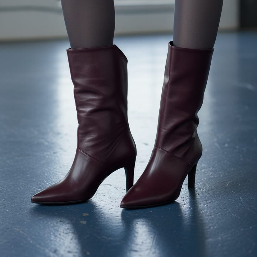 Elegantne ženske čizme od prirodne kože u profinjenoj bordo boji, idealne za moderne i dotjerane kombinacije. Špicasti vrh i stabilna srednja štikla daju ženstvenu siluetu, dok mekana koža omogućava ugodno nošenje tokom cijelog dana.