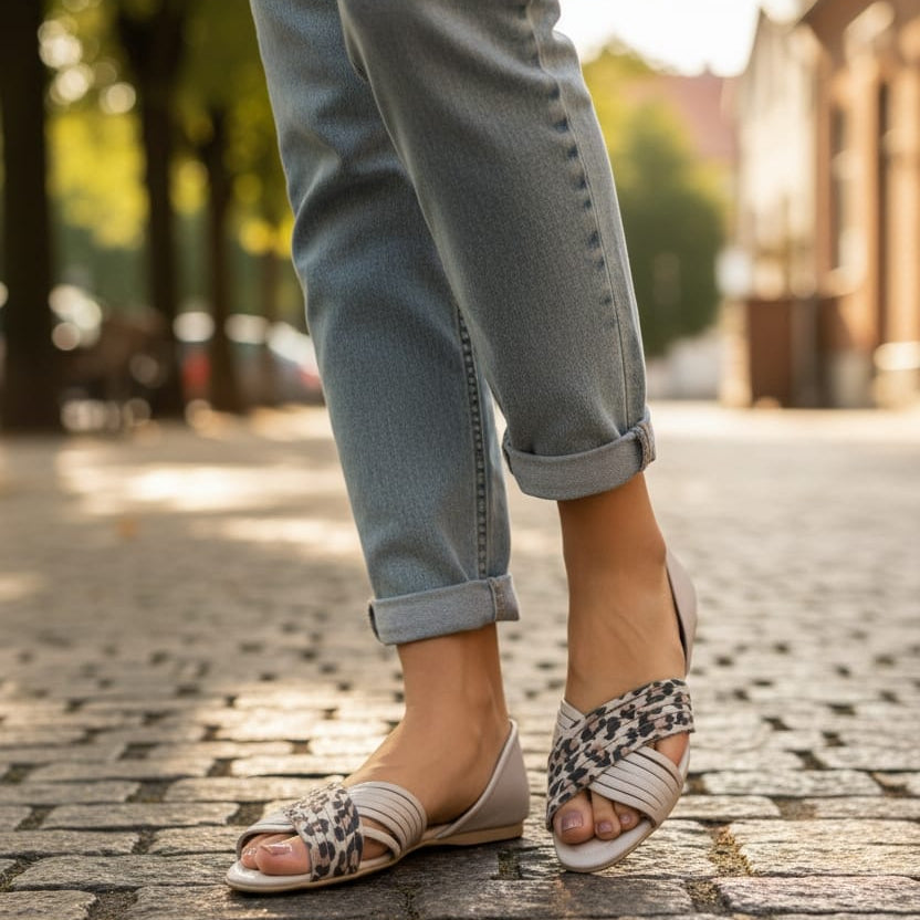 Mekan kožni uložak pruža dodatnu udobnost pri hodu, a fleksibilan đon osigurava stabilnost i lakoću koraka. Neutralna boja i diskretan uzorak čine ove sandale jednostavnim za kombinovanje uz svakodnevne, casual i ljetne outfite.