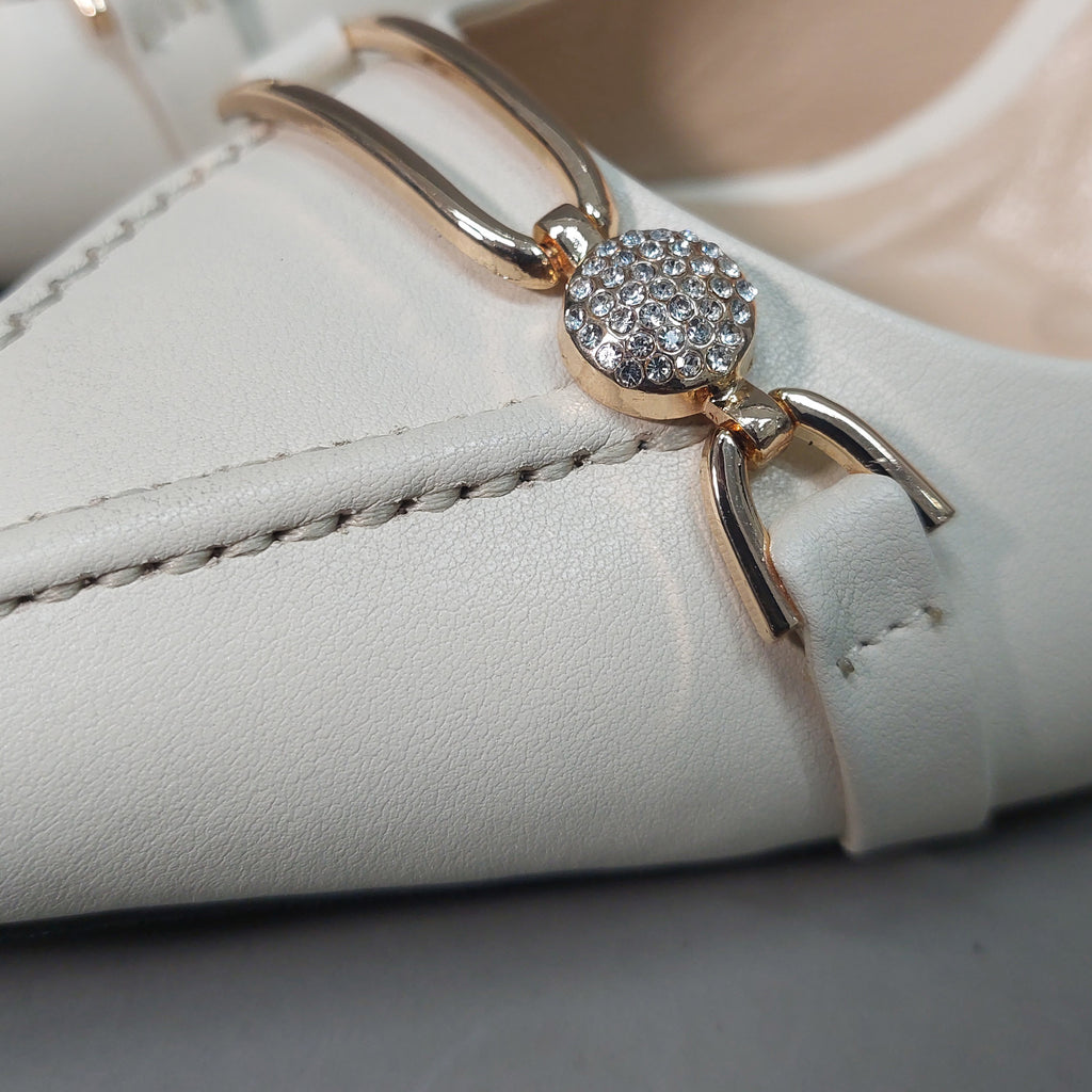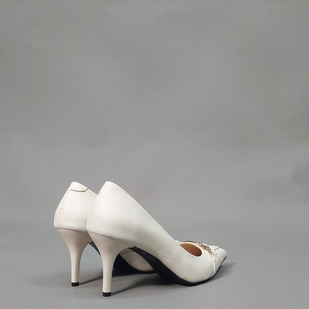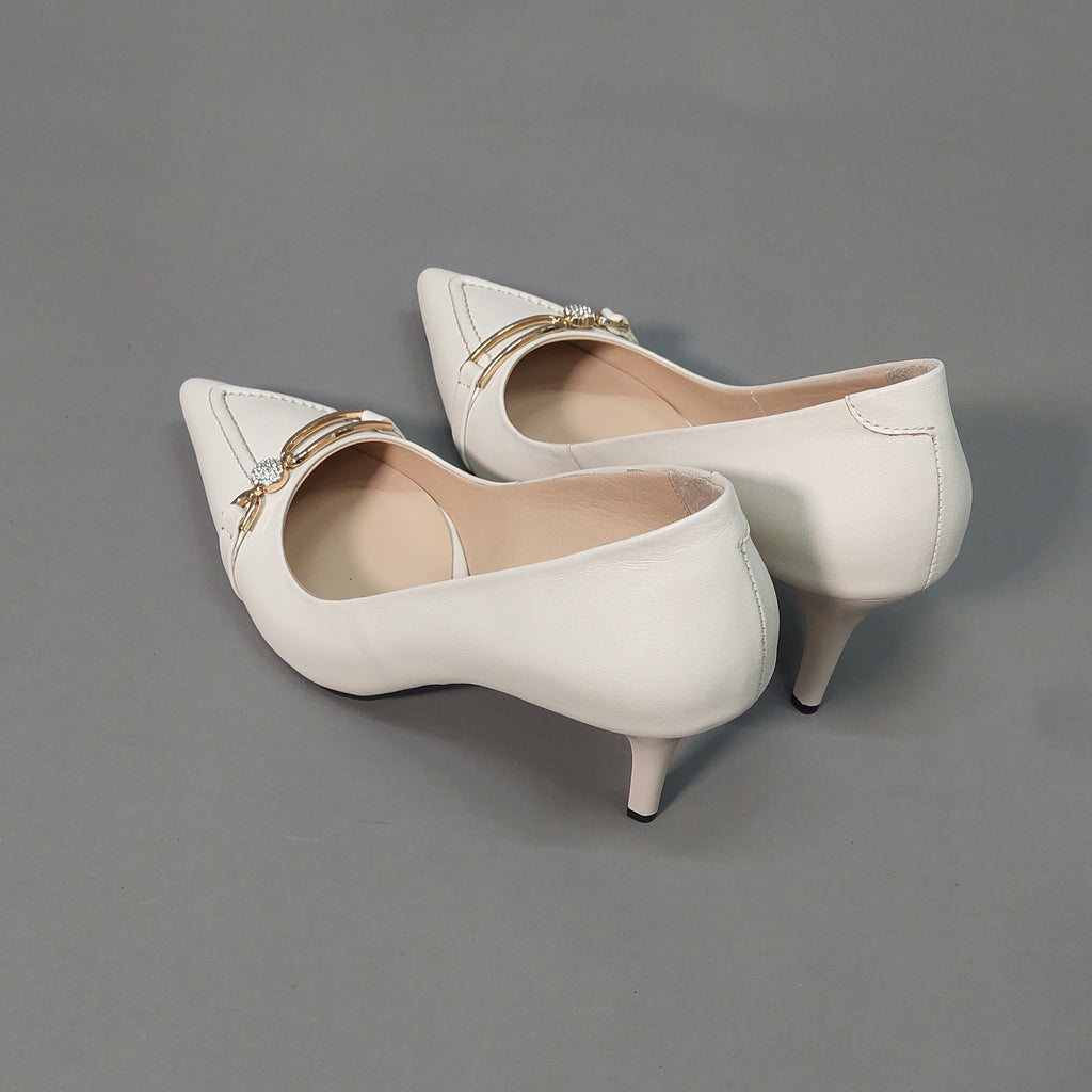 Ove elegantne salonke izrađene su od visokokvalitetne prirodne kože u bijeloj boji, sa špicastim vrhom i vitkom potpeticom koja daje sofisticiran izgled. Diskretan ukras na prednjem dijelu u zlatnom tonu, obogaćen sitnim cirkonima, dodaje notu glamura i profinjenosti.