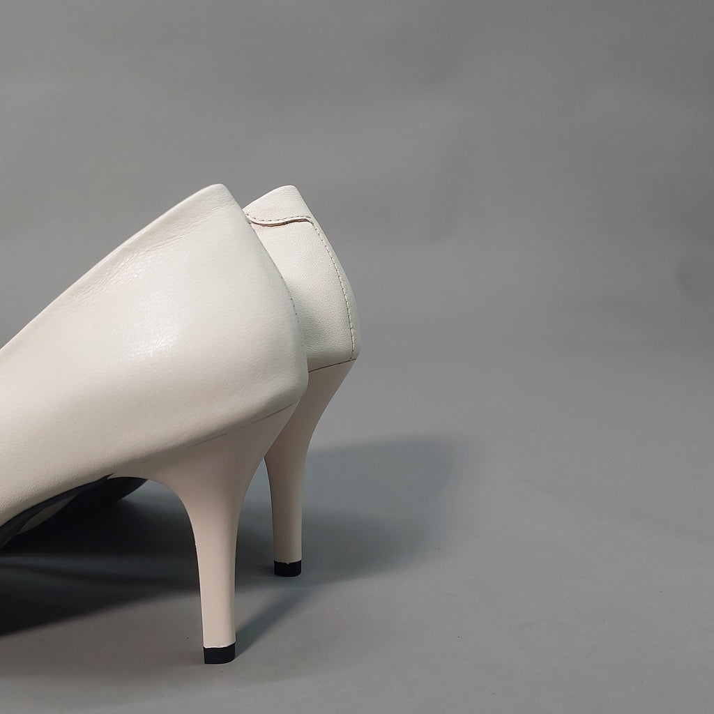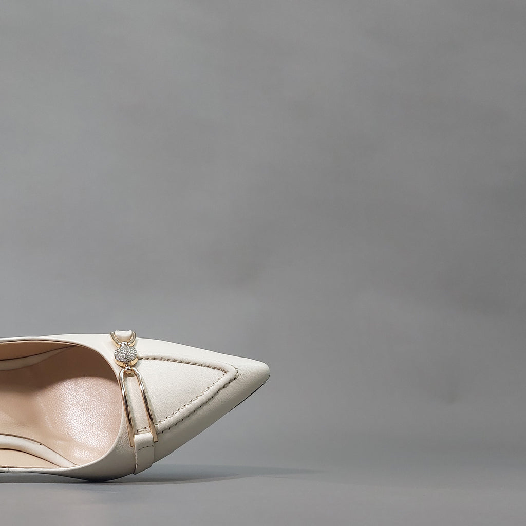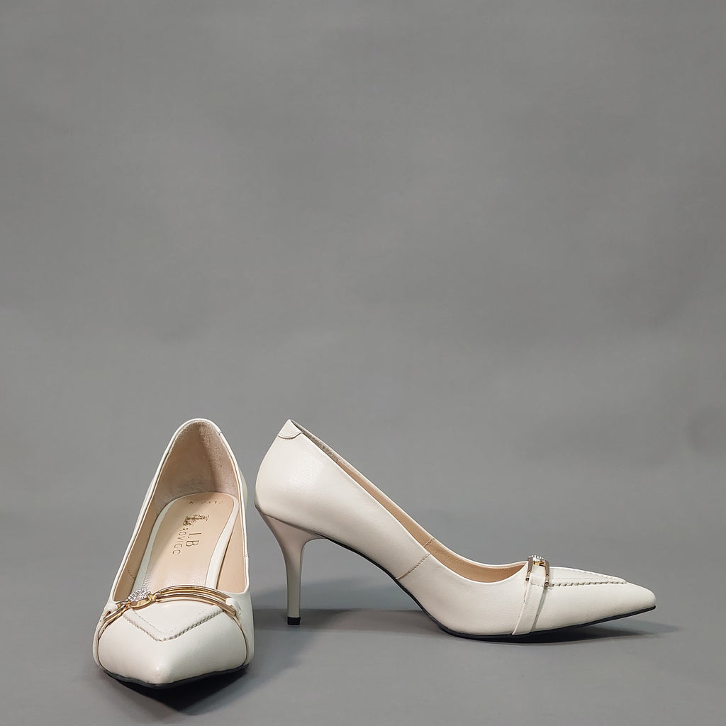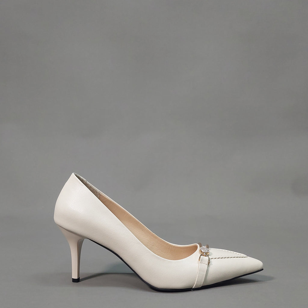 Ove elegantne salonke izrađene su od visokokvalitetne prirodne kože u bijeloj boji, sa špicastim vrhom i vitkom potpeticom koja daje sofisticiran izgled. Diskretan ukras na prednjem dijelu u zlatnom tonu, obogaćen sitnim cirkonima, dodaje notu glamura i profinjenosti.
