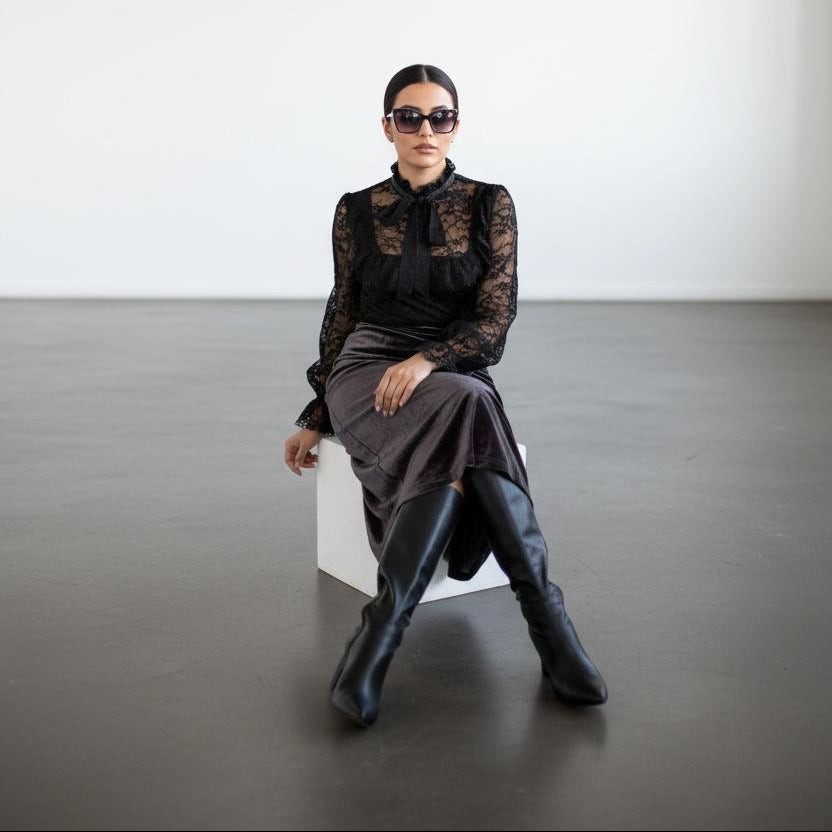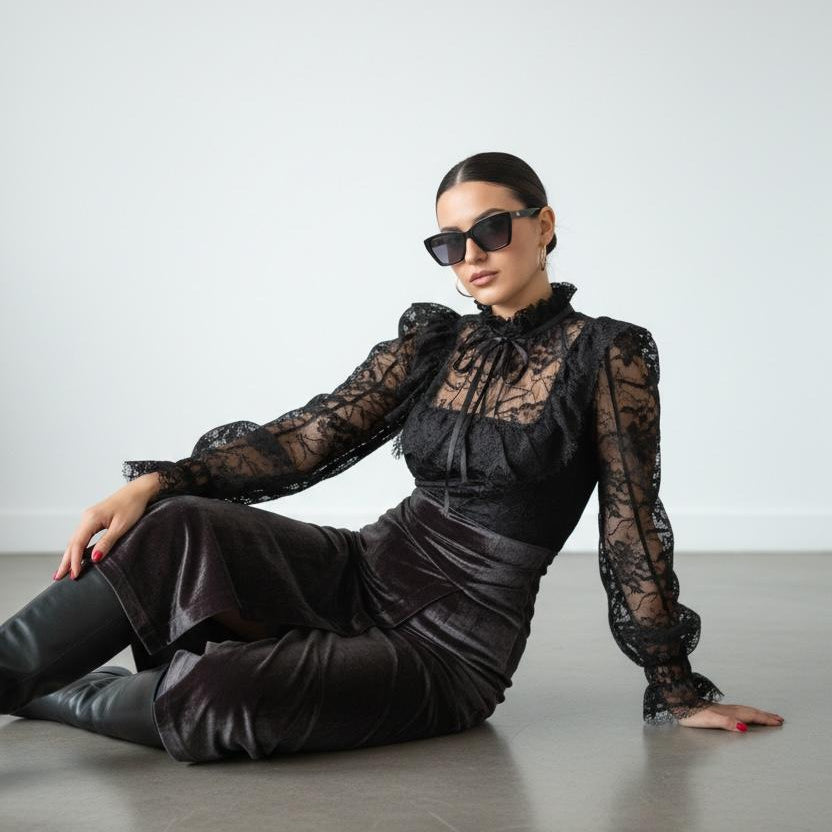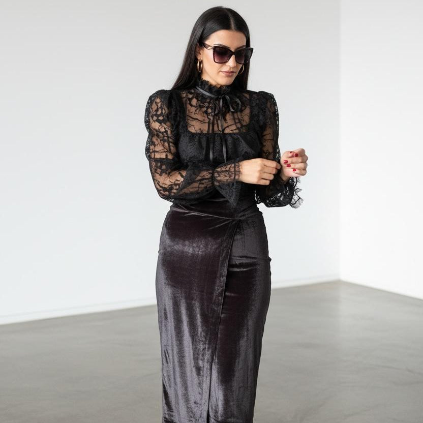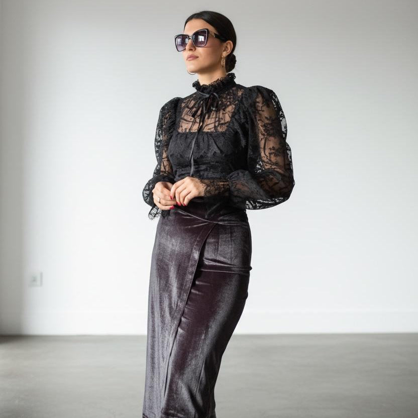 Elegantna kombinacija s izraženim kontrastom tekstura i ženstvenim siluetama. Gornji dio s čipkastim detaljima i visokim ovratnikom daje sofisticiran izgled, dok preklopna suknja naglašava liniju tijela i dodaje dozu elegancije. Idealan izbor za večernje prilike i upečatljive modne kombinacije.