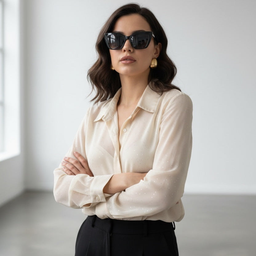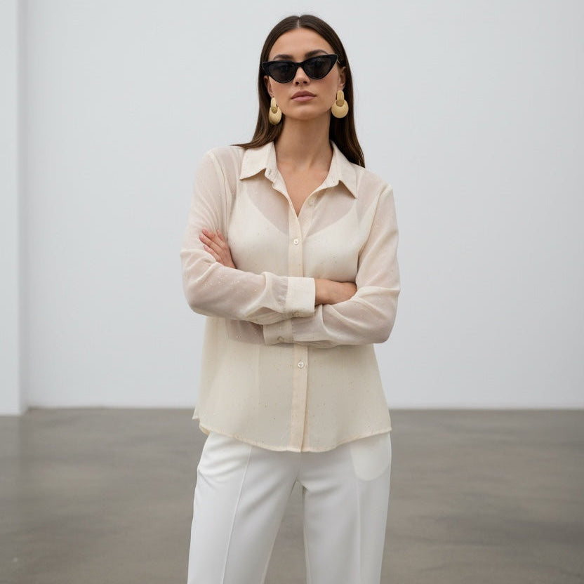 Klasična kragna i dugmad sprijeda daju košulji uredan i svestran karakter, dok blaga transparentnost materijala doprinosi ženstvenosti i lakoći dizajna. Dugi rukavi sa jednostavnim završetkom čine je idealnom za različite prilike – od poslovnih kombinacija do večernjih izlazaka.