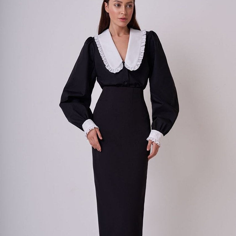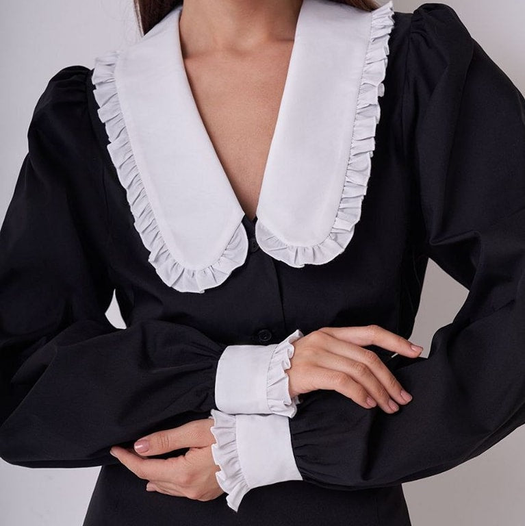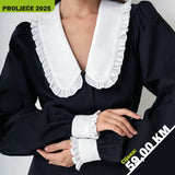 🔹 Velika bijela kragna s volanima – dodaje vintage i elegantan izgled