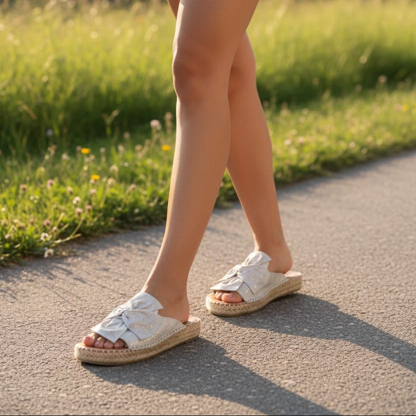 Moderne ženske papuče od prirodne kože, idealne za tople dane i lagane, urbane kombinacije. Elegantna mašna na gornjem dijelu daje poseban vizuelni akcenat, dok platforma u espadrila stilu pruža dodatnu udobnost i stabilnost pri hodu.