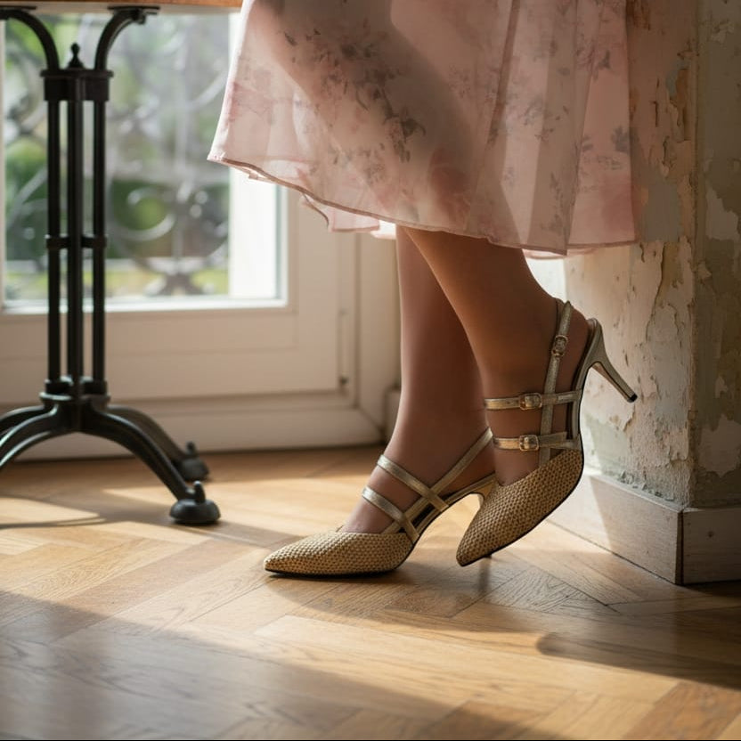 🔹 Kaiševi: Metalik zlatni kaiševi sa sjajnim kopčama, koji pružaju stabilnost i sofisticiran detalj